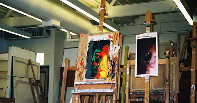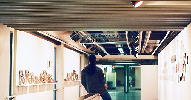 息をひそめて、「じゃ、みんな入って、入って」と友人たちを招き入れる。深夜の大学の構内。日中はアート学部の学生でにぎわうこの建物も、この時間は誰もいない。階段スペースの壁と床に、イラストやスケッチ、油絵、素焼きの陶芸作品などが展示されている。